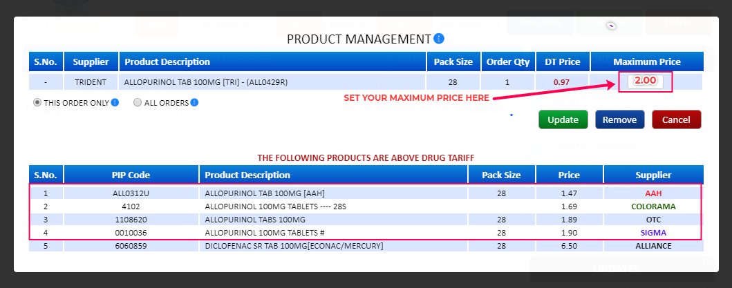 Example: If you set the maximum price of Allopurinol 100mg tablets at £2.00 per pack, then the software will order this product from all the suppliers (by price) automatically up to a maximum value of £2.00. If all the suppliers are out of stock under £2.00 then it will NOT automatically order from any suppliers above £2.00.